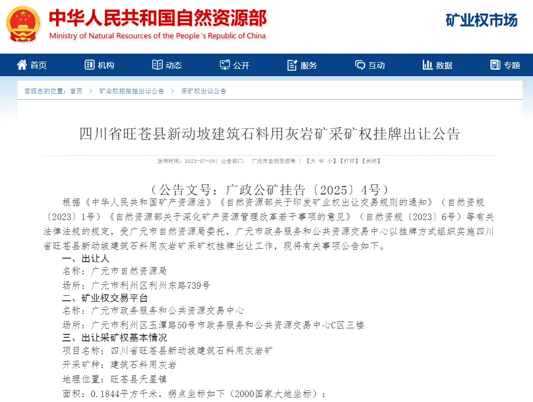 四川省旺苍县新动坡建筑石料用灰岩矿采矿权挂牌出让公告