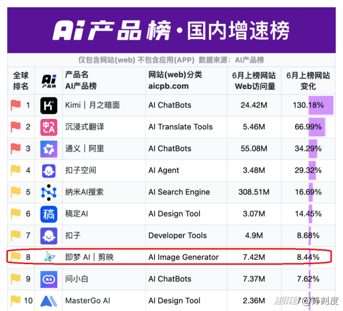 《AI产品榜》的数据显示,在2025年6月的排名中,即梦在国内增速榜中位列第八名,也是国内增速最快的视频生成应用。