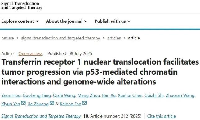 2025年7月8日,中国科学院大学范克龙、南开大学庄洁、中国科学院生物物理研究所阎锡蕴共同通讯在Signal Transduction and Targeted Therapy上在线发表题为“Transferrin receptor 1 nuclear translocation facilitates tumor progression via p53-mediated chromatin interactions and genome-wide alterations”的研究论文。研究证明了TfR1的核易位,并揭示了TfR1和p53在细胞核内的相互作用。