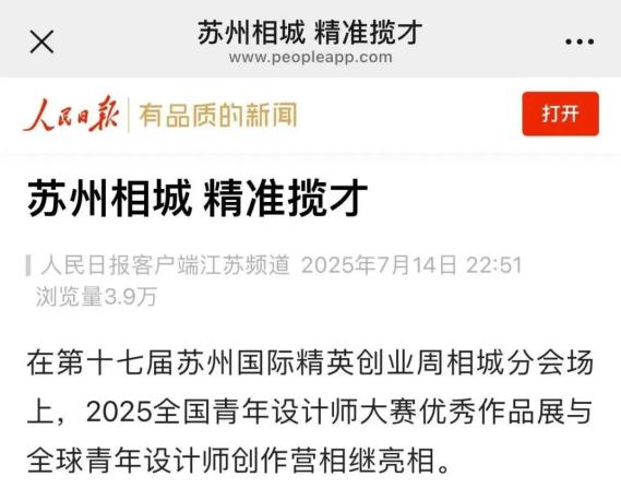 ▼在第十七届苏州国际精英创业周相城分会场上,2025全国青年设计师大赛优秀作品展与全球青年设计师创作营相继亮相。