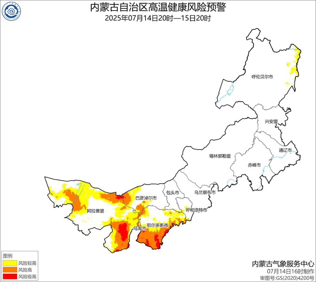 7月14日20时至15日20时,阿拉善盟大部、乌海市、巴彦淖尔市西部、鄂尔多斯市大部、呼和浩特市中部局地和呼伦贝尔市东部局地等高温健康风险较高(黄色预警);其中,阿拉善盟南部、西部和东北部部分地区、巴彦淖尔市西南部、西北部部分地区、鄂尔多斯市南部大部等地高温健康风险高(橙色预警);阿拉善盟东北部局部、巴彦淖尔市西北部局部、鄂尔多斯市南部的部分地区高温健康风险极高(红色预警)。