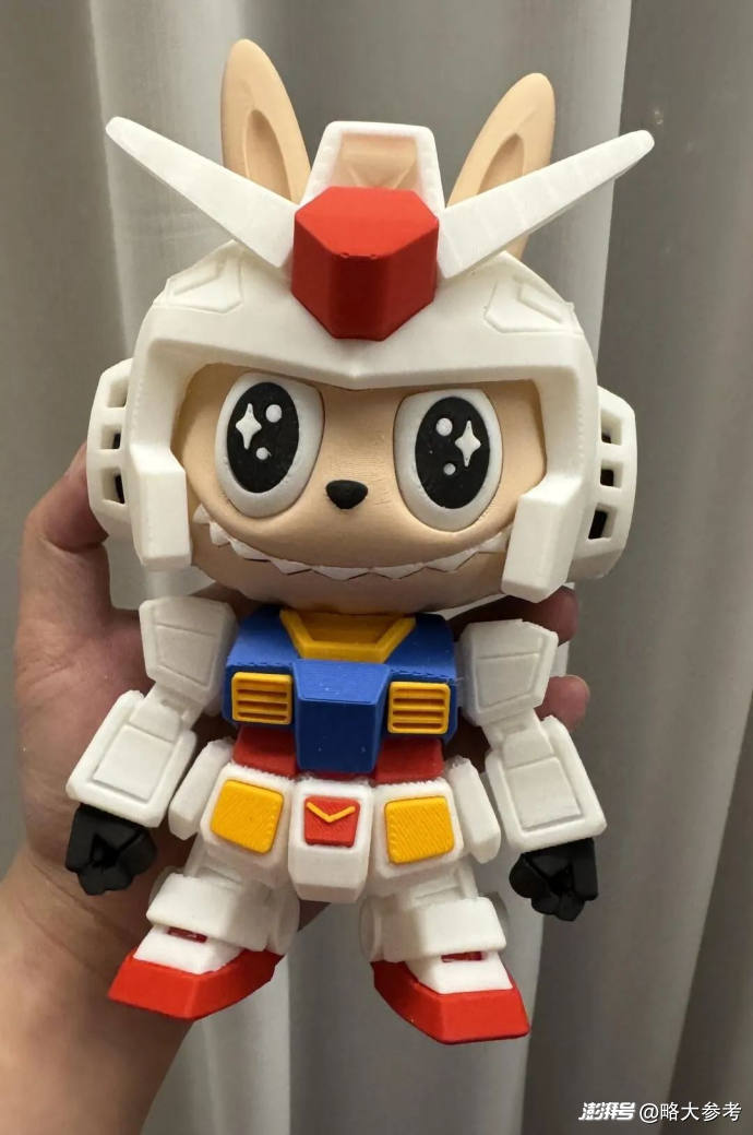 但也有人入坑打印圈之后,越走越远,不断给自己上难度,比如啵妞。在她的社交媒体动态里,她打印的3D版labubu,在原版基础上完成高度还原以外,还和她喜欢的日本IP高达进行了结合,制造出了足够独特的3D版labubu。