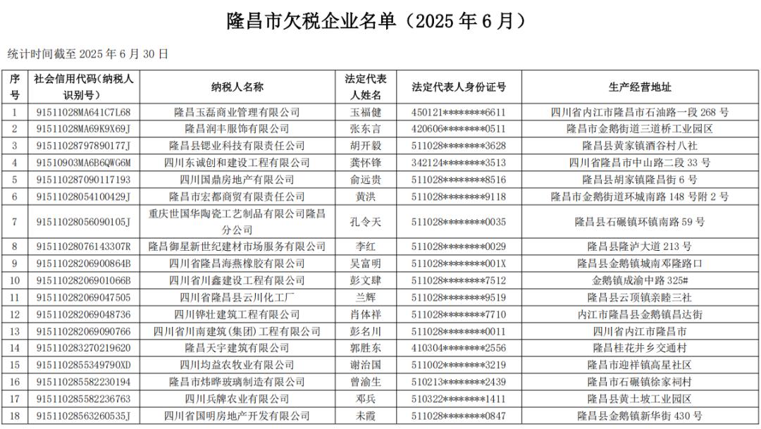 根据《中华人民共和国税收征收管理法》第四十五条和《中华人民共和国税收征收管理法实施细则》第七十六条的规定,现将截至2025年6月30日隆昌市欠税企业名单予以公告。