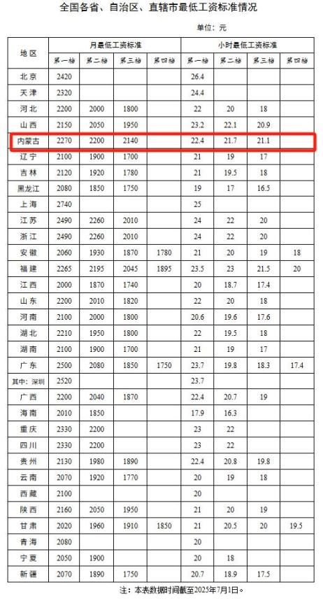 7月15日,人力资源和社会保障部公布了全国各省、自治区、直辖市最低工资标准情况(截至2025年7月1日)。