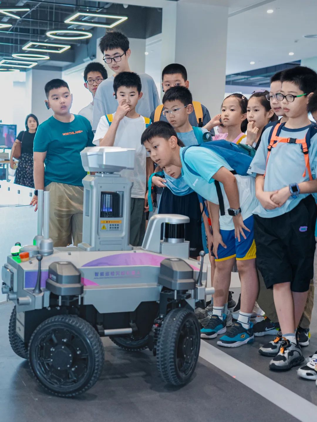 走进机器人奇幻实验室,一秒化身“未来观察员”开启一场现实版“机械探秘”。他们围在列车底部检测机器人前,惊叹它灵巧地钻入轨道缝隙,宛如隐形小侦探,认真排查每一个细节;站在光伏清扫机器人面前,目不转睛地看它一丝不苟地擦拭每一块太阳能板,像个勤劳的小管家;追逐着轨道巡检机器人跑,看它沿着“钢铁巨龙”的轨道巡游,守护着城市的安全运行……