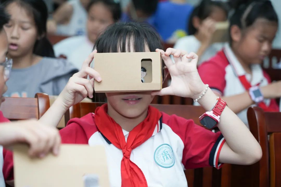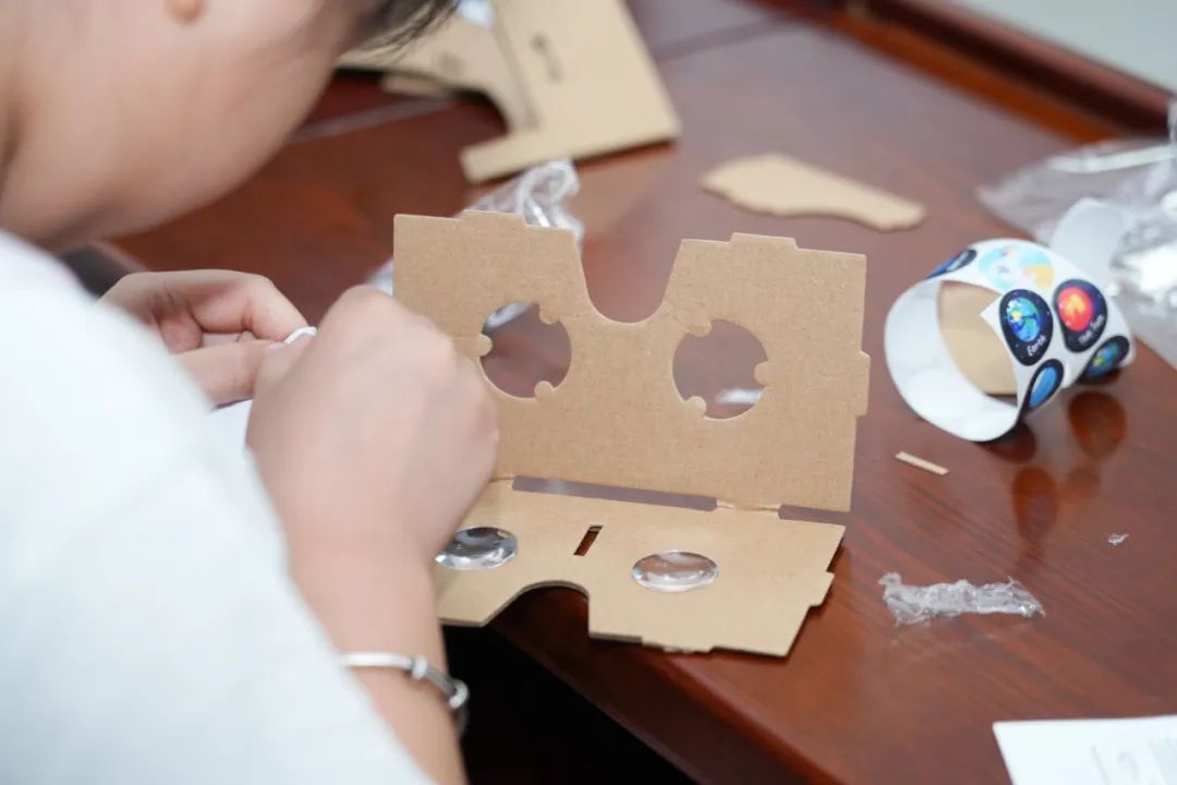 动手环节热闹非凡,孩子们依次完成镜片安装、焦距调整与画面调试,一副副酷炫的VR眼镜在小手中“上线”成功。试戴体验时,教室里充满了惊喜与欢呼,科技的魅力在孩子们的眼中悄然点亮。