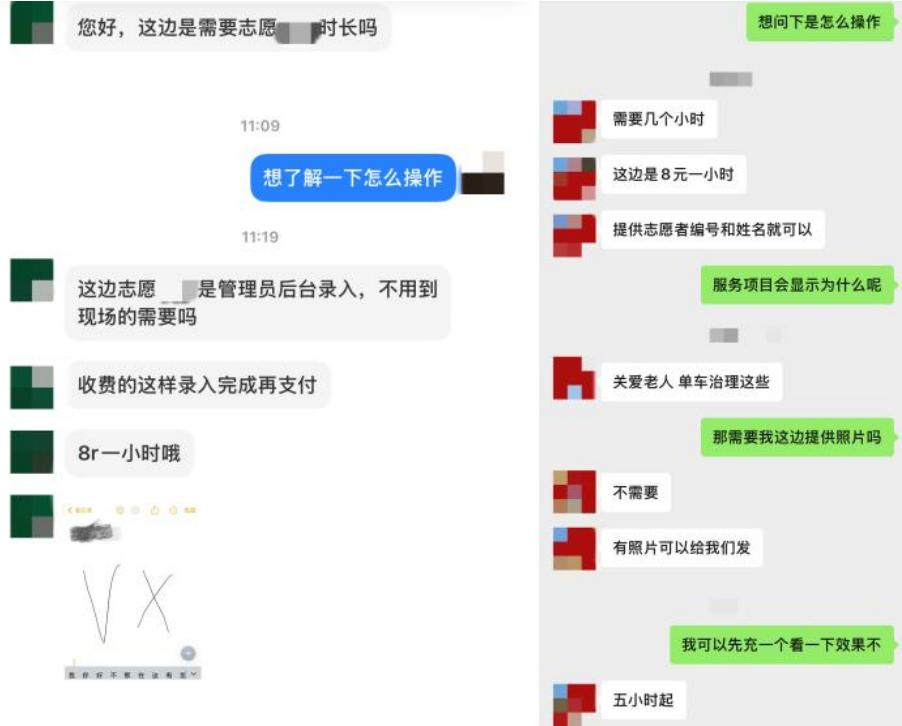 央视网《新闻+》记者以学生家长身份加入了一个名为“志愿时长活动交流”的群聊。入群后,负责人很快主动联系,并热情介绍:“无需到场,管理员后台录入,8元1小时哦。”对方称,服务项目可标注为“关爱老人”“单车治理”等常见类型,仅需提供姓名与志愿者编号,无需提交任何服务过程照片,时长即可录入系统。