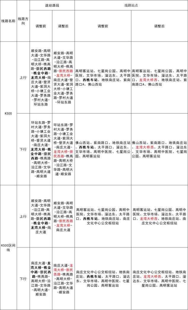 需转乘南海线的乘客,可在K500线路调整停靠的龙湾大桥西站搭乘K2、江01、樵17线等南海线路。