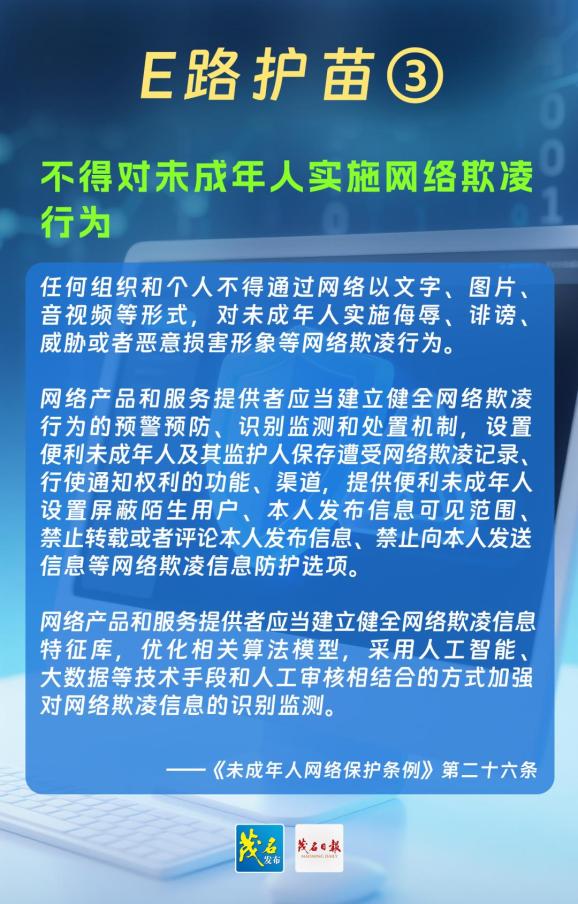 原标题:《E路护苗③ | 划重点!《未成年人网络保护条例》:不得对未成年人实施网络欺凌行为》