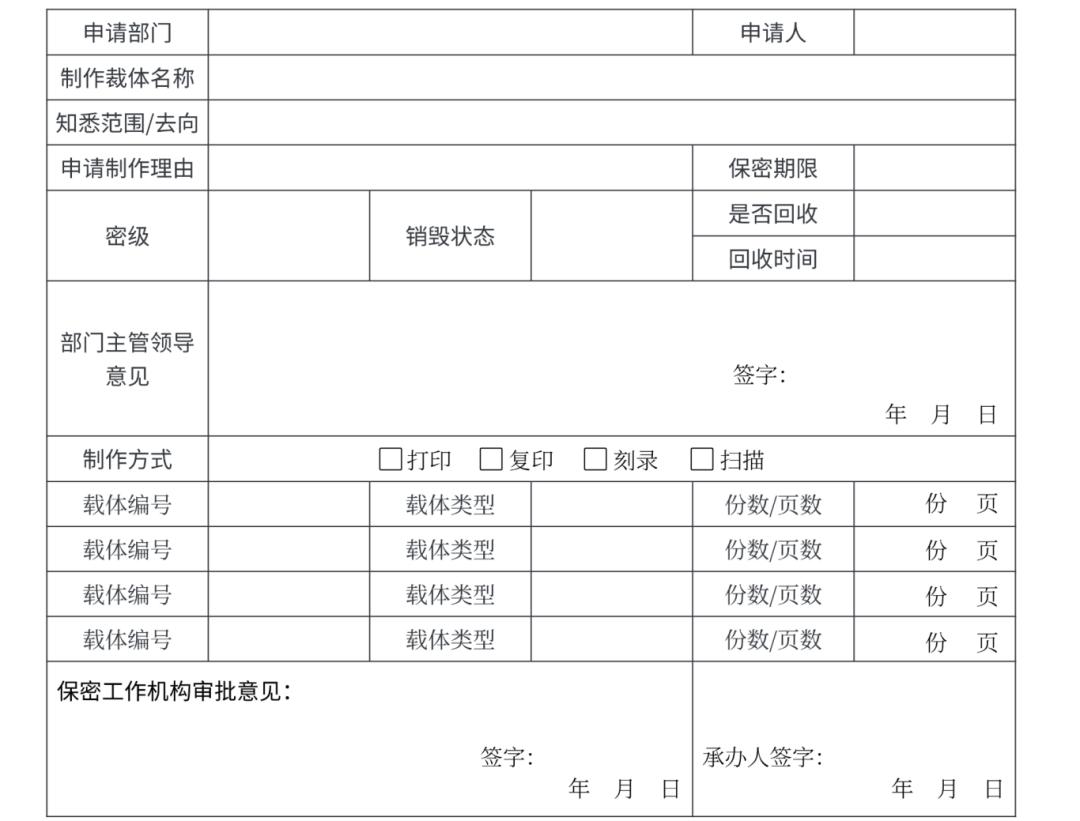 动手复印前,必须经过批准并履行审批手续!填好《涉密载体制作审批表》,明确申请部门和申请人、文件名称、知悉范围、复印理由、保密期限、密级、文件状态、文件编号、载体形式、复印数量等信息。