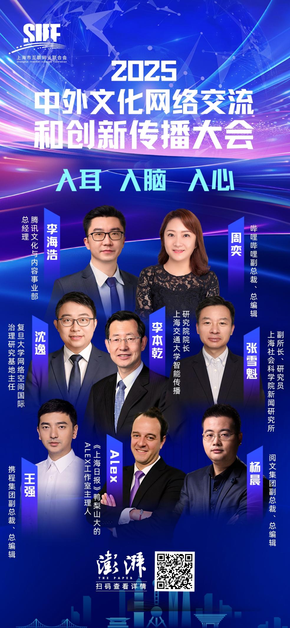 为加强中外文化网络交流,促进全球文化多样性融合发展,“入耳 入脑 入心”——2025中外文化网络交流和创新传播大会将于7月20日在上海举办。本次大会由上海市委网信办、上海市政府新闻办、上海文化发展基金会指导,上海市互联网业联合会和杨浦区委宣传部联合主办,澎湃新闻、杨浦区融媒体中心(网信中心)承办。
