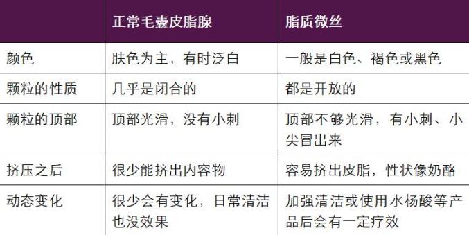 另外,还有不少人有另外一个问题——脂质微丝,或者叫做皮脂丝。皮脂丝的出现,是因为皮脂的分泌过剩,它们容易堆积在毛囊,没有完全排出到毛囊之外,外加死皮细胞、灰尘等物质,混合在一起之后,就容易导致毛囊扩大,形成肉眼可见的小颗粒、小点。