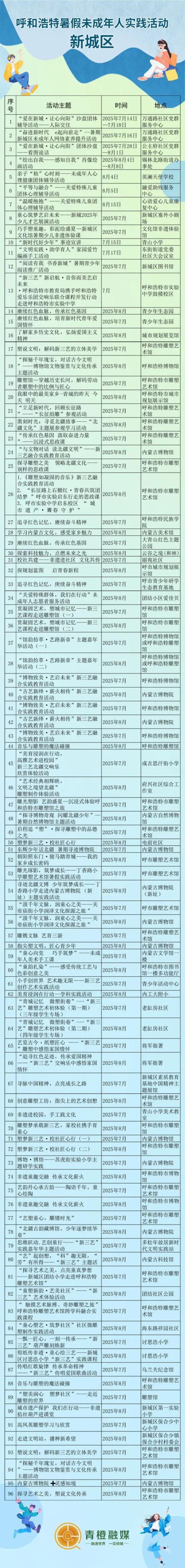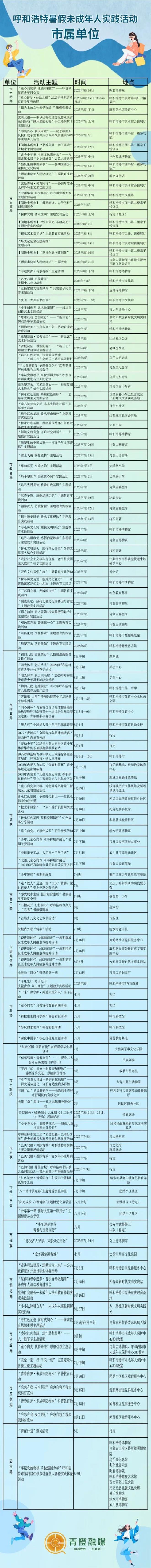 暑假余额已充值,娃的精彩活动安排上了吗?我们贴心汇总了呼和浩特市各委办局、旗县区文明实践中心为孩子们准备的暑期“精神大餐”!再也不用全网扒拉活动信息了!从书香阅读到非遗体验,从科普研学到健康讲座,从红色传承到活力健身... 覆盖全城,类型超全!这份官方“宝藏活动地图”请收好,轻松解锁家门口的精彩假期!