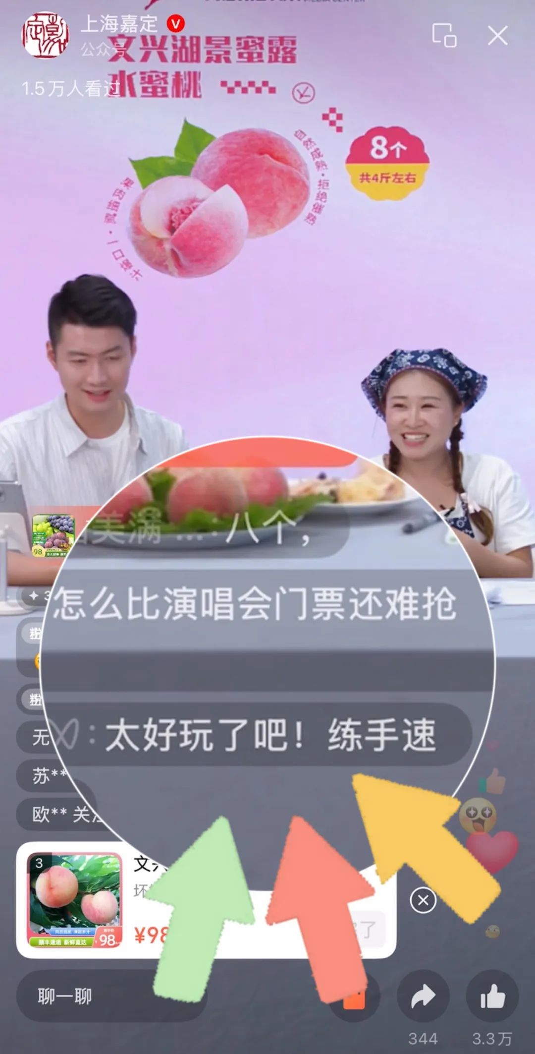 两个小时的直播带货刷屏嘉定“朋友圈”,从阿唐和阿沁亲情演绎的直播预告《豪掷三千万,霸总回“嘉”只为土产!》便掀起了全网热潮,吸引了超3.5万人次观看。直播当晚,霸总阿唐和农场主阿沁更是强强联手卖爆单:当晚交易865件、销售额达5.06万元。其中“一咬一窟水”的水蜜桃更是上架即秒没,唐总霸气直呼“赶紧加单!”,网友评论“真是比演唱会门票还难抢啊!”