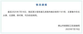 截至2025年7月18日,我区累计报告基孔肯雅热确诊病例1161例,主要集中在乐从镇、北滘镇、陈村镇,均为轻症病例。
