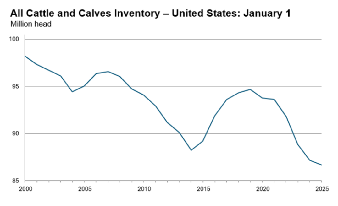 美国牛肉行业面临着一系列挑战,其中最根本的原因是牛群数量的减少。美国国家农业统计局数据显示,截至2025年1月1日,美国牛和小牛的数量为8670万头,较2019年的牛群最高峰下降了8%,这是自1951年以来的最低水平。