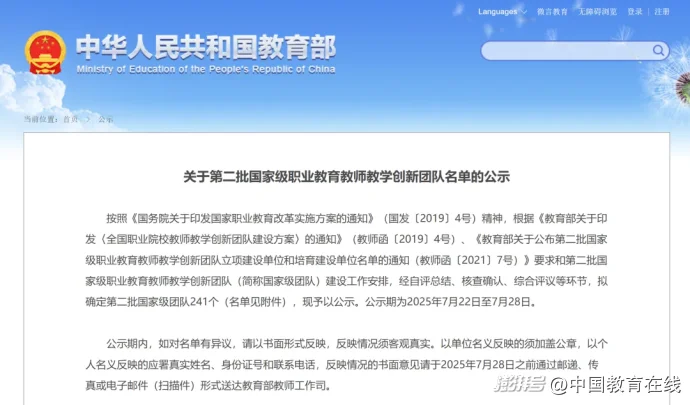 7月22日,教育部教师工作司发布《关于第二批国家级职业教育教师教学创新团队名单的公示》,经自评总结、核查确认、综合评议等环节,拟确定第二批国家级团队241个,公示期为2025年7月22日至7月28日。