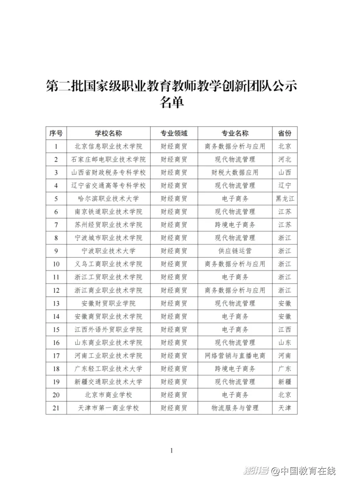 第二批国家级职业教育教师教学创新团队公示名单如下: