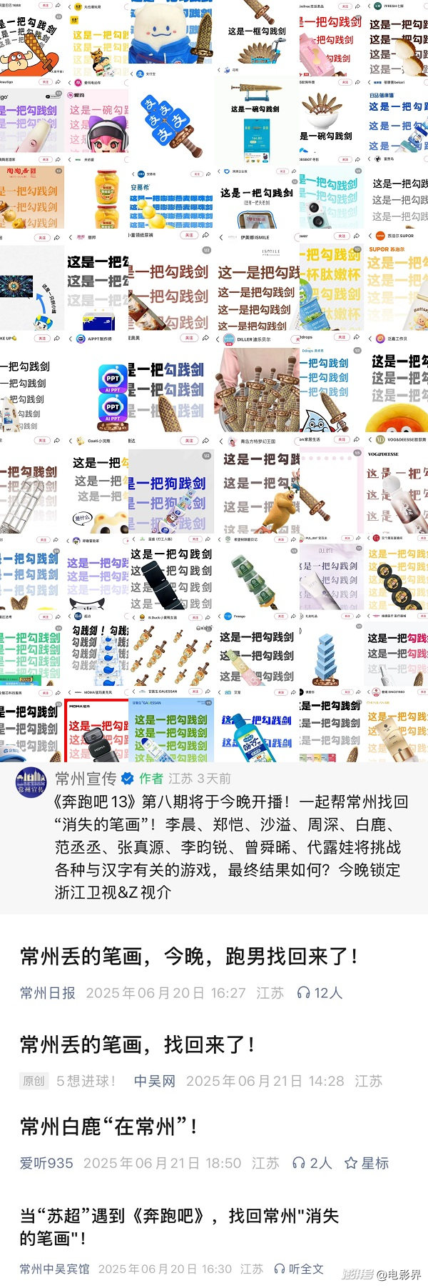 在稳固的数据背后,节目真正的“杀手锏”在于其无可比拟的“造梗”能力。本季节目,全网累计热搜超32808个,其中微博主榜热搜584个,堪称“行走的爆梗生产线”。孟子义的一句话,让“这是一个勾践剑”游戏全网热梗出圈,抖音收获百万点赞,多次登陆微博主榜热搜,同时引爆支付宝、滴滴、安慕希、绝味鸭脖、创维集团、银鹭、七度空间等超1500个品牌蓝V下场玩梗,湖北省博物馆连夜上架的文创周边卖到脱销;常州篇的“笔画保卫战”联动了当地的“苏超梗”,引发常州宣传、常州日报、中吴网等多家本地媒体花式互动,称“跑男帮常州找回了丢失的笔画”,实现了节目与城市文旅的双向奔赴。这些数据不仅是内容的胜利,更是国民IP与大众情感同频共振的最好证明。
