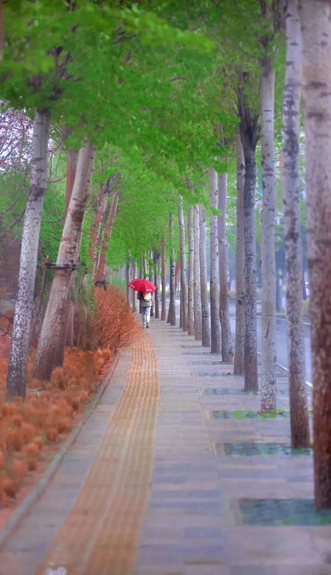 街道两旁高大的树干撑起“绿伞”,