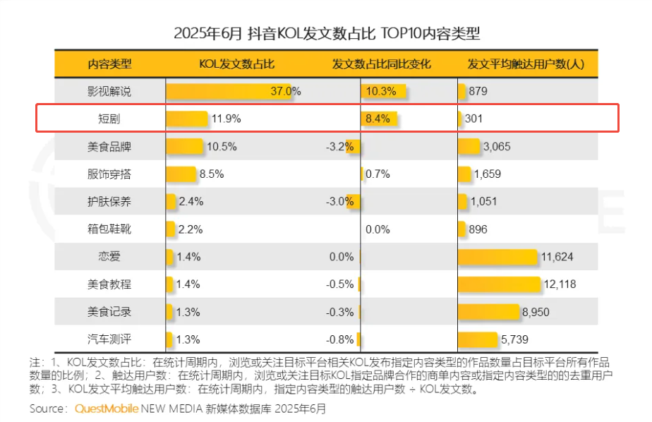 在抖音平台KOL发文内容方面,短剧类内容占比达11.9%,位居第二,发文数占比同比去年同期,增加了8.4%。