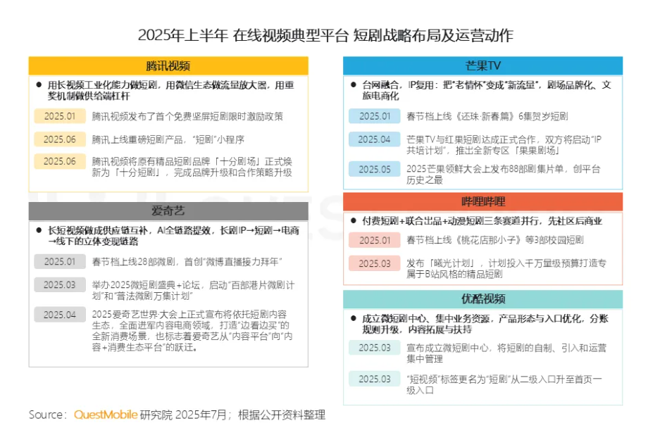 2025年上半年,腾讯视频、芒果TV、爱奇艺、哔哩哔哩、优酷视频等长视频平台加速短剧战略布局,借助自身优势特长形成差异化布局运营。