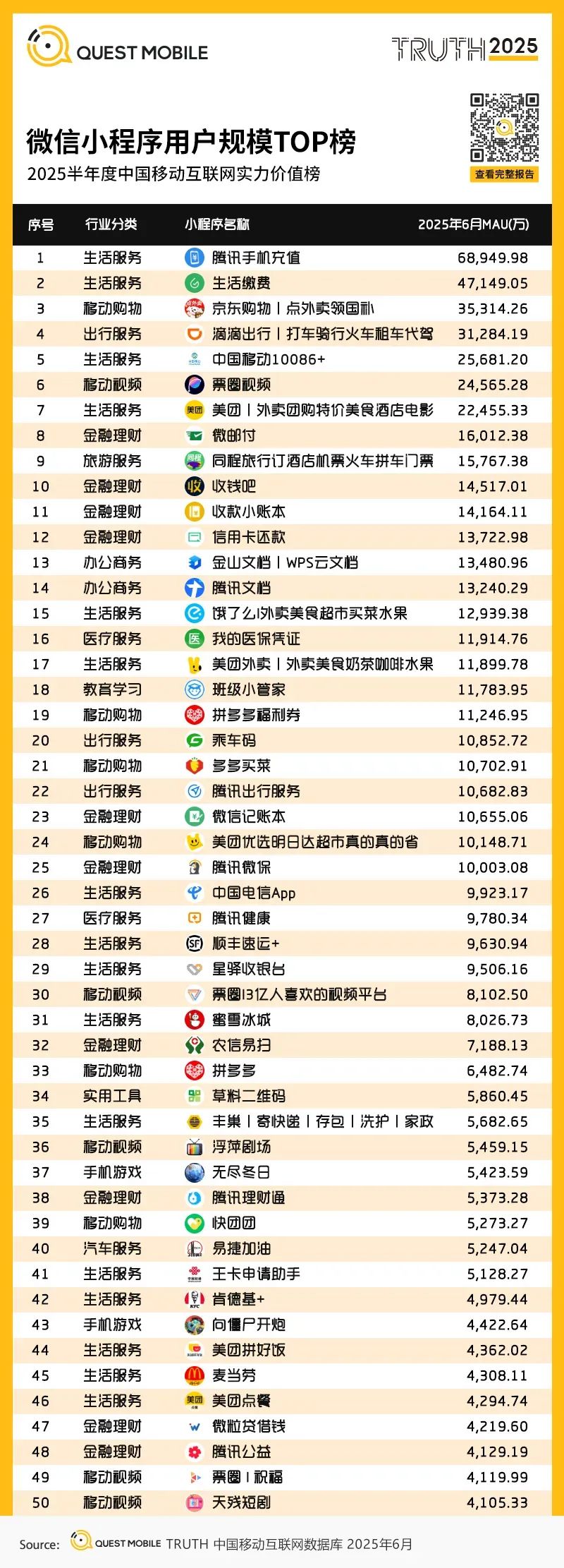 在微信小程序方面,有两款短剧小程序用户规模闯入TOP50,为容量旗下的浮萍剧场,位居第26,月活用户超5400万,天残短剧位居第50,月活用户超4100万。