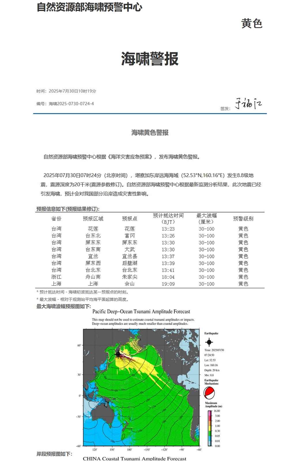 自然资源部海啸预警中心根据《海洋灾害应急预案》,发布海啸黄色警报。