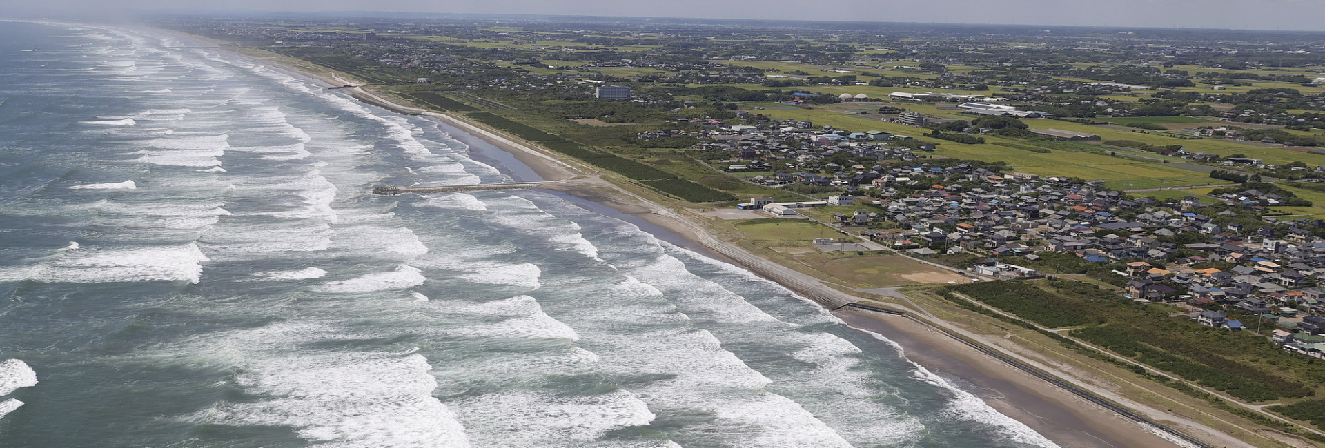 7月30日,日本千叶县,九十九里滨白色海浪拍打海岸。