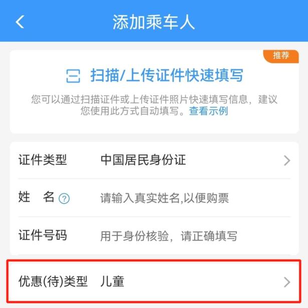 02按照提示添加乘车人信息,优惠(待)类型选择【儿童】。