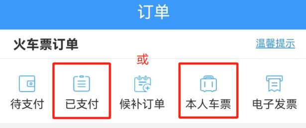 01成人旅客购票后,点击【订单】—【已支付】,也可点击【订单】—【本人车票】找到申报入口。