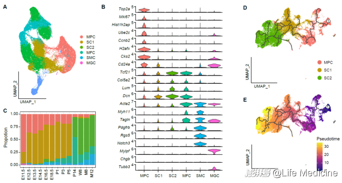 在对单细胞数据经过批次校正后,研究人员将高质量的单细胞数据整合到一个统一的数据集中,使用均匀流形近似和投影(UMAP)对所有细胞进行了聚类,并根据标记基因的表达获得了7种主要细胞类型和31个细胞簇。为了深入了解卵巢间充质细胞的发育过程,研究人员根据典型标志物的表达将其中间充质细胞类群分为6个不同的细胞亚群,包括肌源性细胞(MGC)、肌成纤维细胞(MFC)、平滑肌细胞(SMC)和三个基质细胞亚群。这些间充质细胞组成也显示出沿发育线的动态变化。在基质细胞的三个亚组中,一组细胞命名为间充质祖细胞(mesenchymal progenitor cells, MPCs),它们高度表达细胞表面干细胞标志物CD24和DNA复制相关基因,如Top2a,Ccnb2等。另外两种基质细胞,1型基质细胞(SC1)主要存在于胎儿和新生儿卵巢(E11.5-P5),2型基质细胞(SC2)主要存在于P14-M12卵巢。研究人员通过伪时间分析发现了胎儿和新生小鼠卵巢从MPC到SC1的发育路线,然后在P14继续分化为SC2,直到卵巢衰老。