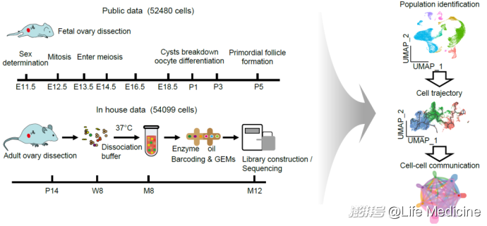 研究人员利用公共数据,收集了采用10xGenomics技术测序的来源于同一品系小鼠(C57BL/6)的单细胞RNA测序数据(从E11.5至P5)。此外,他们还对P14(出生后14天)、W8(8周)、M8(8月)和M12(12月)的小鼠卵巢进行了相同技术的测序,从而补全了小鼠从E11.5原始生殖细胞迁移至生殖嵴开始,直至12个月时卵泡闭锁和生殖储备耗尽的整个卵巢衰老过程。通过分析这一完整的卵巢发育周期,研究者对生殖细胞和体细胞进行了高精度的分类,并分别探究了这些细胞的分化发育轨迹、各阶段的功能以及关键基因。这项研究不仅为理解卵巢发育提供了重要的实验数据,还进一步加深了对卵巢体细胞,尤其是间充质细胞在卵巢发育和衰老中发挥功能的理解。