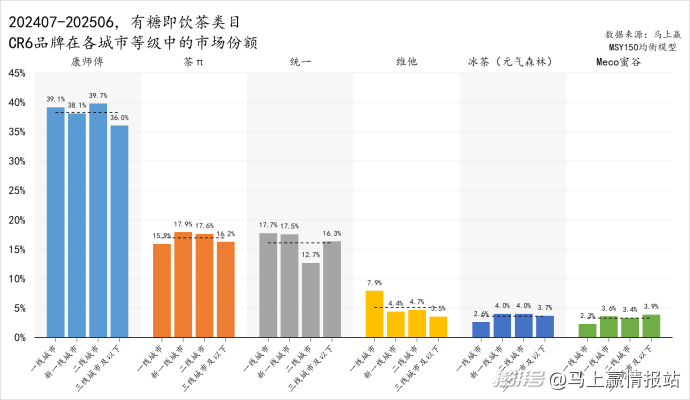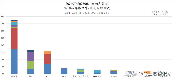 相比之下,传统头部品牌康师傅虽然依旧拥有约40%的市场份额,但在同比增速层面几近持平,市场增长已趋稳定。统一与茶π稳居腰部阵列,市场份额均在15%-20%区间,稳步修复中。
