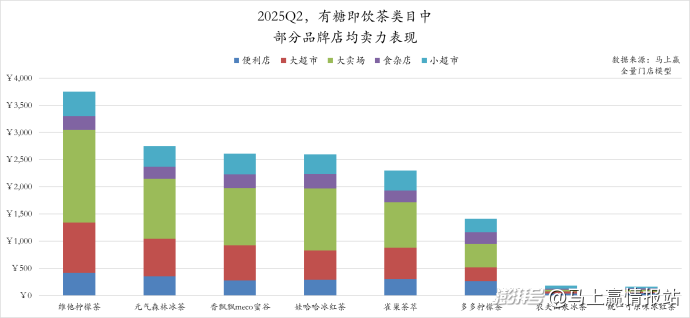 首先从店均卖力的角度看,在2025Q2,除去康师傅、统一等领先较为明显的品牌外,后续几名的店均卖力整体相差不算太大。可以看到,维他柠檬茶之后,元气森林冰茶在店均卖力上依然保持着领先,对于娃哈哈冰红茶、雀巢茶粹、多多柠檬茶等依然保持着较明显的优势。