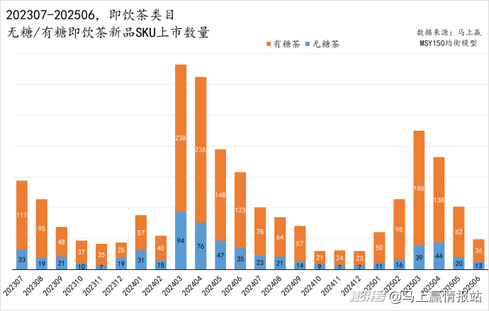 从上新数量上,则可以看到不一样的切面。为了应对夏日饮料旺季,大多数冰饮适用性的产品都会选择在每年的3、4月上新,提前造势。数据上可以看到,无糖茶的SKU上新数量在今年同比去年近乎腰斩,有糖茶的上新数量同比去年也较低,但降幅远远小于无糖茶。另一个值得关注的点在于,即便是在2024年3、4月无糖茶最火热的时刻,有糖茶的新品上市数量也是无糖茶的两倍有余,这也体现了双方在规模与赛道宽度上的差距——无糖茶热度虽高,却与有糖茶始终有着差距。