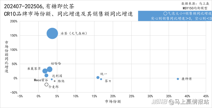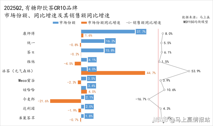 另一个值得注意的变化是腰尾部品牌的分化加剧。雀巢茶萃、娃哈哈等品牌虽份额不高,但同比增速显著,显示出“中小体量、高成长性”的潜力趋势。反观今麦郎则处于市场份额低、增长为负的“失速区”,其销售额同比增速也同样为负。