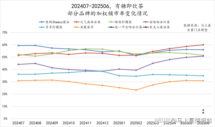 对于竞争的另一个观测维度则是铺市率。可以看到,近一年(2024年7月-2025年6月),有糖即饮茶市场不同品牌的加权铺市率格局出现一定变化。多数品牌经历一个冬天的蛰伏后,加权铺市率在今年上半年的旺季一路走高,但其中的格局与细节上,也正在发生一些微妙的排序与趋势上的变化。