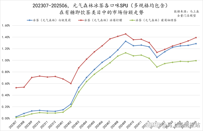 在上文中,我们从202407-202506、2025Q2两个维度,都看到了元气森林冰茶的“飞速增长”,其市场份额同比增速、销售额同比增速均>40%,对于饮料品类来说,这是一个相当突出的同比增速。