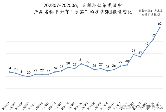 在线下零售的瓶装饮料产品领域,这股“冰茶”风同样强劲。可以看到,在有糖即饮茶类目中,产品名称中包含“冰茶”一词产品数量正在2025年迅速壮大(产品名称为冰红茶、冰绿茶等的产品均不在其列)。这一数据一方面,得益于作为“新冰茶”开创者的元气森林冰茶,其系列产品不断的拓展口味、规格、出新数量越来越多;另一方面,或许也来自于更多跟随元气森林冰茶加入到“新冰茶”队伍中的品牌与产品。他们跨过了稍显传统的、沿用了数十年的冰红茶、冰绿茶等产品命名与定义规则,直接选择加入“冰茶”来经营一个全新的产品线或品牌。