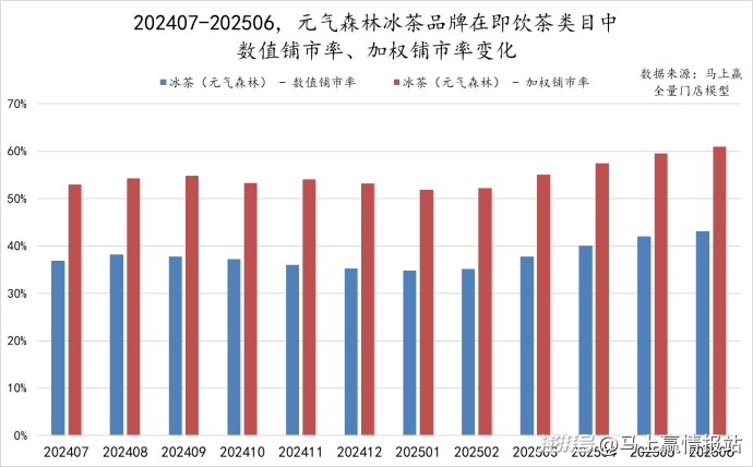 市场份额、销售额同比的快速增长,来自于渠道铺市率的快速增加。可以看到,在过去的一年中,元气森林冰茶的数值铺市率与加权铺市率呈现出同步、持续的增长趋势,特别是在2025年Q2阶段两者双双突破新高。其中加权铺市率上升约10%,明显超过数值铺市率增长幅度,意味着元气森林冰茶不仅在更多门店上架,而且在“销售能力强”的门店中占比更高,终端布局更为精准有效。这一趋势充分验证了元气森林冰茶在渠道端的强执行力和产品吸引力,为其后续动销和市占提升提供了坚实基础。