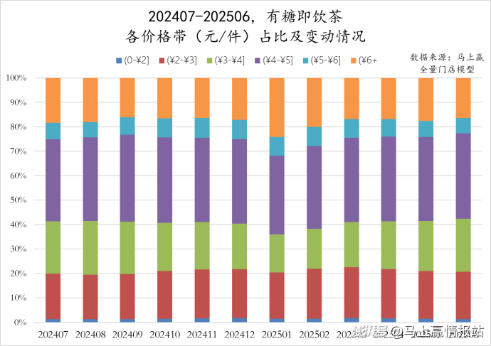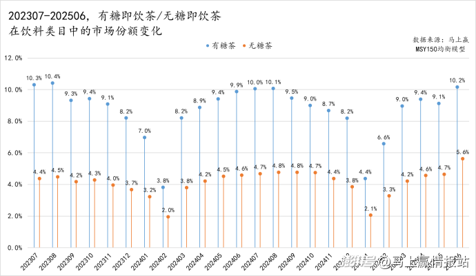 基于马上赢品牌CT中的数据可以看到,同样是在饮料类目中,有糖茶的规模在202307-202506始终高于无糖茶将近一倍,即便是在2024年的夏日,以及2025年刚刚到来的5、6月饮料旺季,也依然没有打破这个“一倍”规模的惯例。另一方面,整个有糖茶在饮料大盘中的市场份额亦实现了轻微的同比提升,似乎打破了过去几年“无糖茶持续走强、有糖茶份额下滑”的体感与叙事。