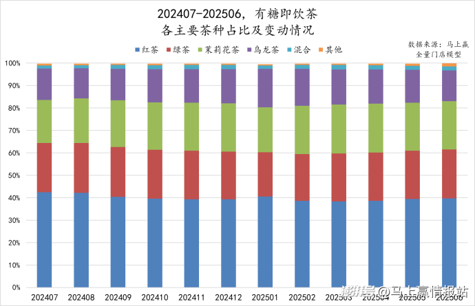 值得注意的是,乌龙茶作为近年来无糖茶的主力茶种,虽在有糖茶中尚未成为主流,但其市场份额稳定在10%以上,仍属“重要基底”。混合型茶基底与其他小众茶种整体占比较小,未出现明显放量趋势。