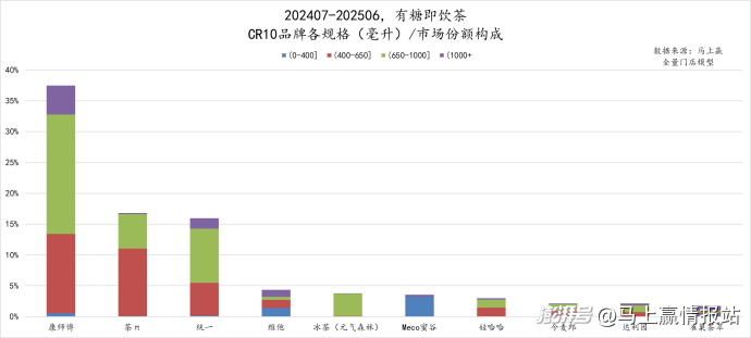 从有糖即饮茶的CR10品牌各规格市场份额构成来看,康师傅、茶π、统一、维他等大多数集团均以多规格产品构成其在类目中的市场份额,相对规格带覆盖单一的仅有元气森林冰茶几乎100%的650-1000ml规格带占比,以及Meco蜜谷约80%的0-400ml规格带占比。