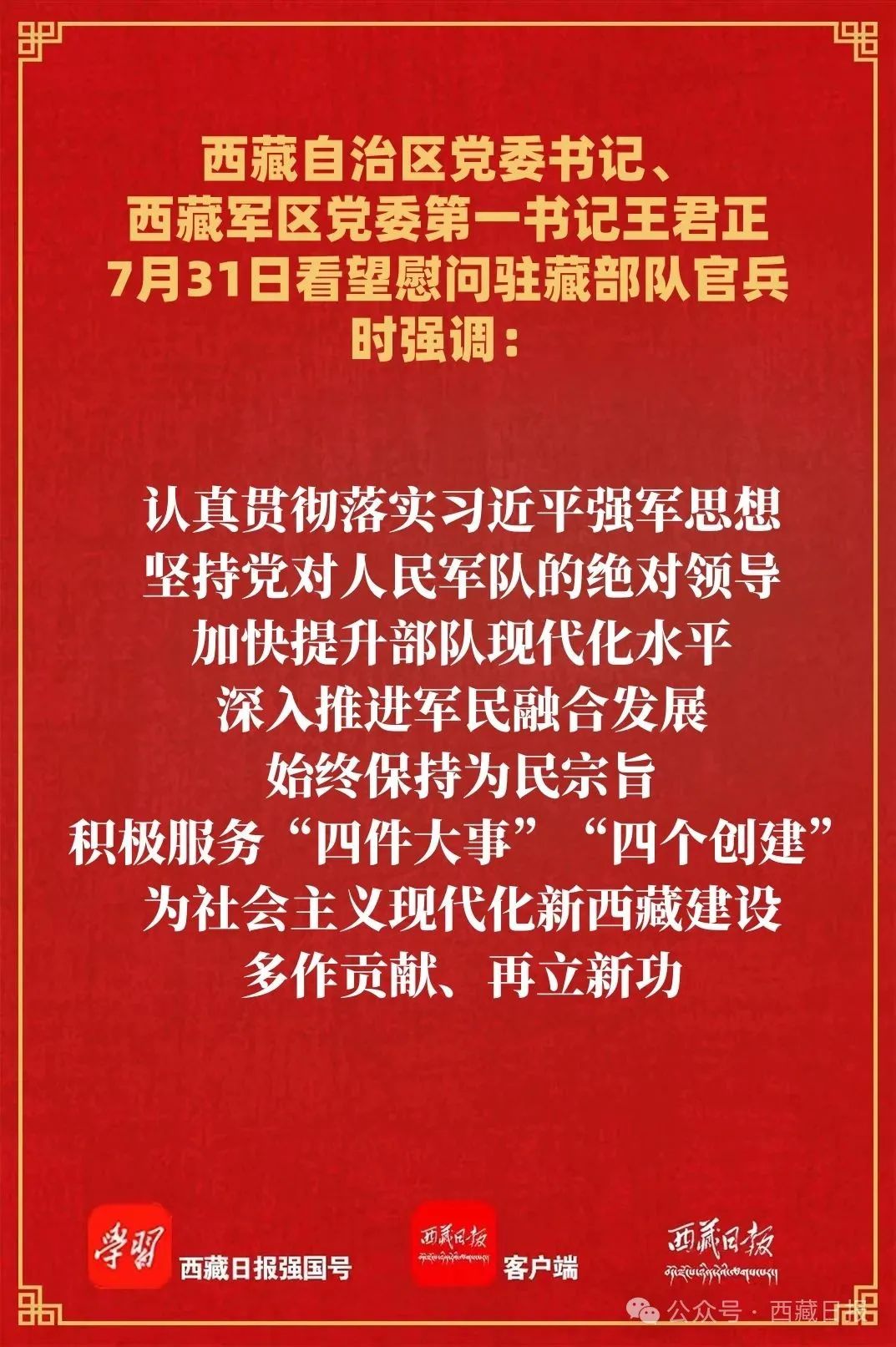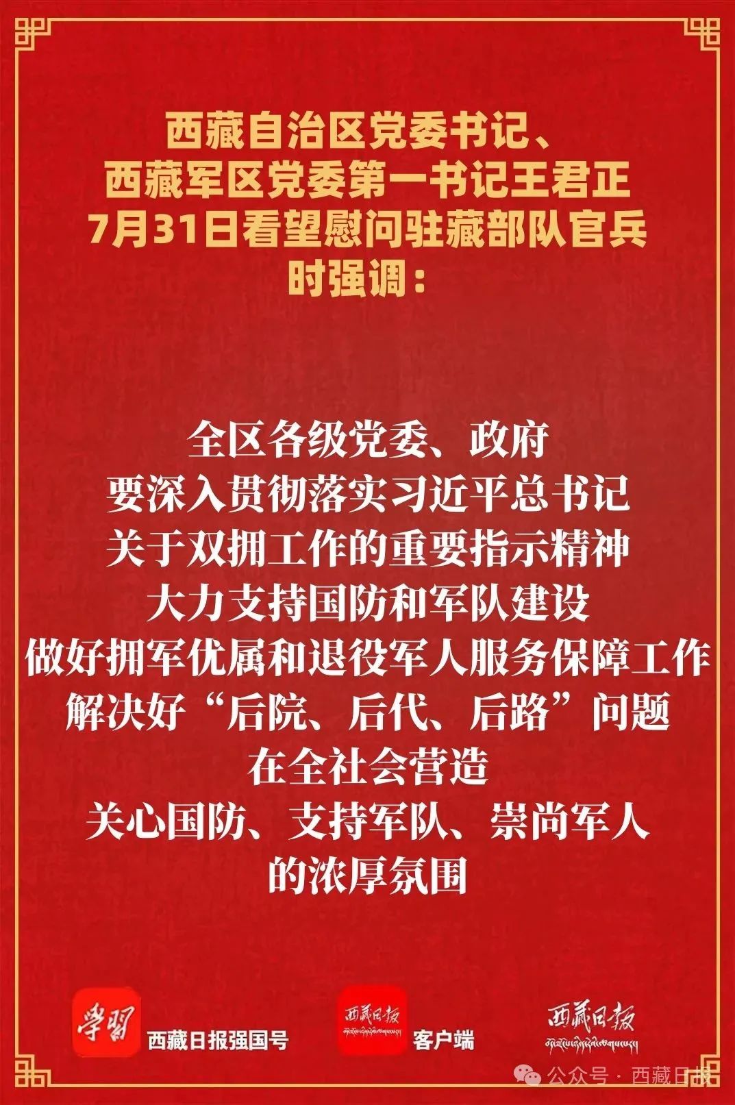 王君正强调,今年是自治区成立60周年。面对新形势新任务,希望驻藏人民解放军和武警部队官兵深刻领悟“两个确立”的决定性意义,增强“四个意识”、坚定“四个自信”、做到“两个维护”,认真贯彻落实习近平强军思想,坚持党对人民军队的绝对领导,加快提升部队现代化水平,深入推进军民融合发展,始终保持为民宗旨,积极服务“四件大事”“四个创建”,为社会主义现代化新西藏建设多作贡献、再立新功。全区各级党委、政府要深入贯彻落实习近平总书记关于双拥工作的重要指示精神,大力支持国防和军队建设,做好拥军优属和退役军人服务保障工作,解决好“后院、后代、后路”问题,在全社会营造关心国防、支持军队、崇尚军人的浓厚氛围。