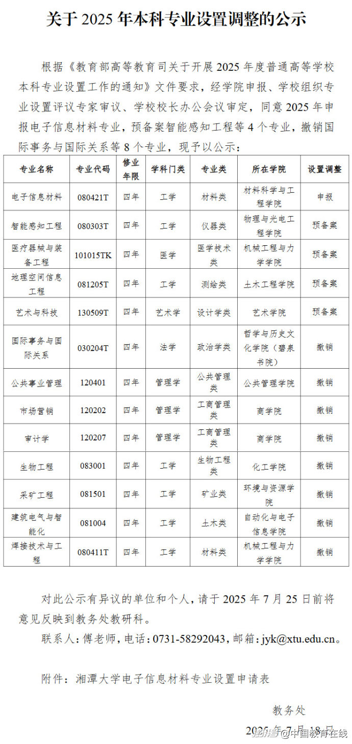 近日,湘潭大学发布《关于2025年本科专业设置调整的公示》。