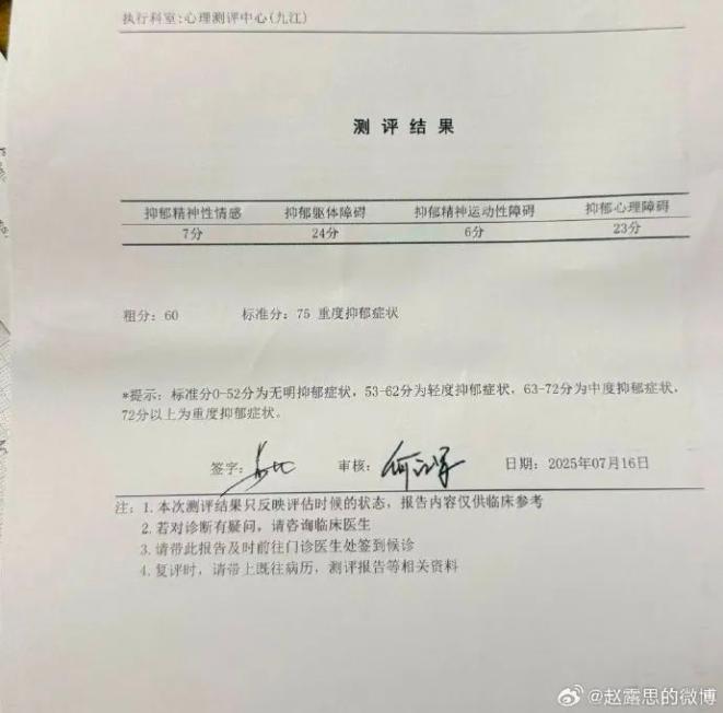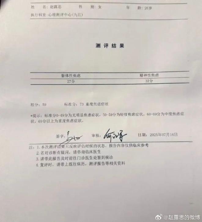 刚刚,赵露思发文谈解约风波,并晒出重度焦虑和抑郁测评报告:等到现在也没有等来任何沟通,前年愚蠢的续约还有四年的经济约,所以人家也不着急,就我难受着。 因为意外生病只能被迫取消掉一部分品牌代言,减少拍摄压力,口口声声说你们来负责我这次的意外生病,结果是我来赔钱。难道不用协商就可以从我工作室划走钱?再骗我财务签掉分账单。205w已经给掉了 协商无果 之后还要接着再给是吗?再三沟通也不同意归还工作室的运营权,团队工作人员还剩几个?八个月等待一个处理结果。 这就是结果?剧组解散了就是结果?全跑了就是结果?最后我来赔钱就是结果?跟我说我可能要被封杀最近不要有任何动态,就是解决吗?我聊解约,你说你家人也有病。都说不容易 ,做演员一步一步到今天不容易,你们就是拿捏着我的不容易,容易的成为今天的你们,我内核超烂,也不体面,但不用你们封杀我 ,我不干了,如果我当时报警,如果我当年报警 ,今天也说不出“合法”两个字吧,所以宝贝们,遇见任何危急情况,不要相信任何带有目的的安抚行为,最重要的就是报警!立刻报警。