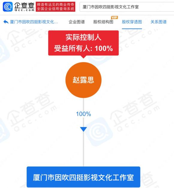 据企查查信息显示,赵露思名下关联2家企业,厦门市因吹四挺影视文化工作室为存续状态,上海赵露思影视文化工作室已注销。其中,厦门因吹四挺由赵露思持股100%,该企业已申请超280枚商标,包括“小小的守护基金”公益基金商标,“ROSYWYLIE”甜品店商标,爱犬Doe“DOEDD”等商标。