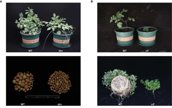 图3|两个薯块功能重要基因DRN和CLF的突变体表型爆发:种群的“演化”