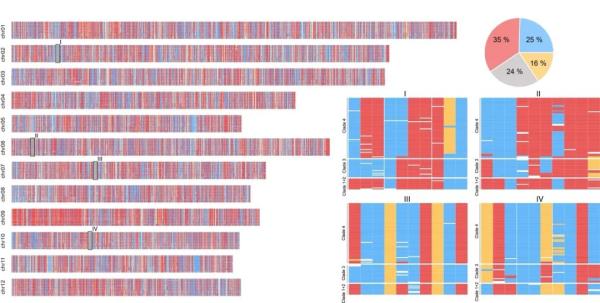 研究团队进一步发现,现今马铃薯组内部物种仍约有24%的遗传组分随机固定了不同亲本的等位基因,呈现出亲本镶嵌的“马赛克式”模式。即,不同个体携带不同亲本的遗传信息,就像一幅由不同颜色小瓷砖拼成的马赛克画一样,导致表型呈现不均一性(图4)。